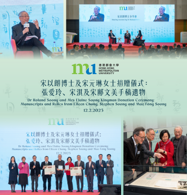 Eileen Chang holds an eminent position in the Chinese literary world. In November 2024, Hong Kong Metropolitan University (HKMU) had the honor of receiving a generous donation from Dr Roland Soong, the administrator of the late Eileen Chang's estate, and his sister, Mrs Elaine Soong Kingman. This donation includes a collection of valuable manuscripts, personal items, and correspondence between Eileen Chang and her close friends, Stephen Soong and Mae Fong Soong (the parents of the Soong siblings), among others. These materials provide insight into Eileen Chang's creative journey and the influence of the Soong couple on her work and personal development. This donation ensures that these invaluable documents and genuine items will be permanently housed at HKMU, enriching the literary community and researchers, and promoting the study of modern Chinese literature and digital humanities innovation.