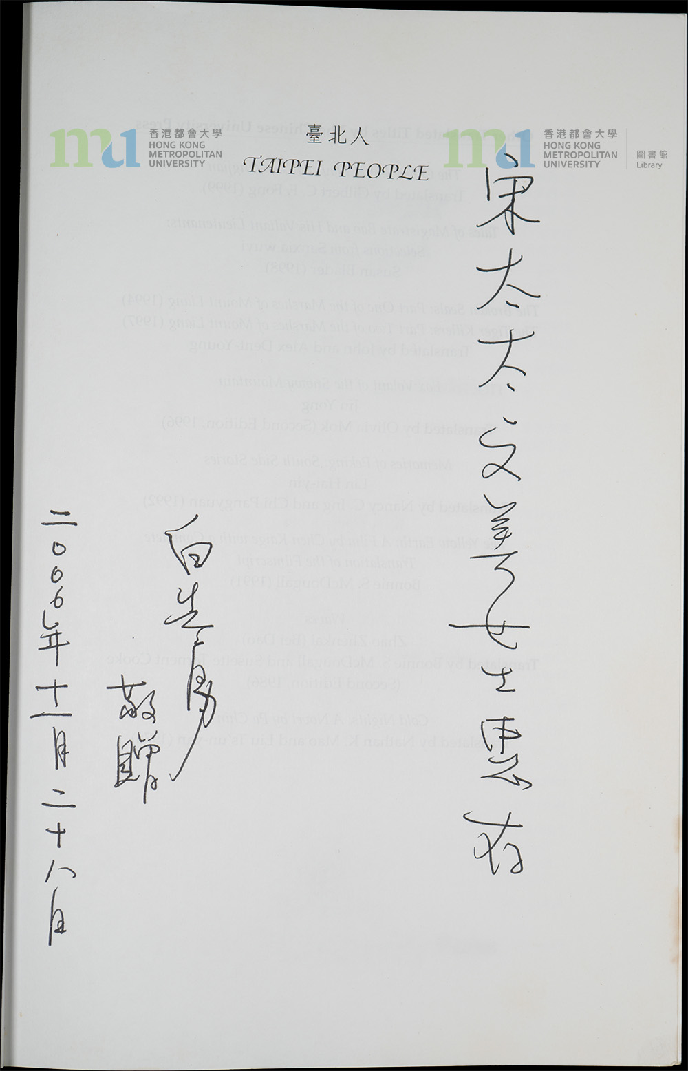 Part of: 09 - 《臺北人》簽名本 (由白先勇贈與宋鄺文美) = Signed Copy of Taipei People (Presented by Pai Hsien-yung to Mae Fong Soong) (2 objects)
