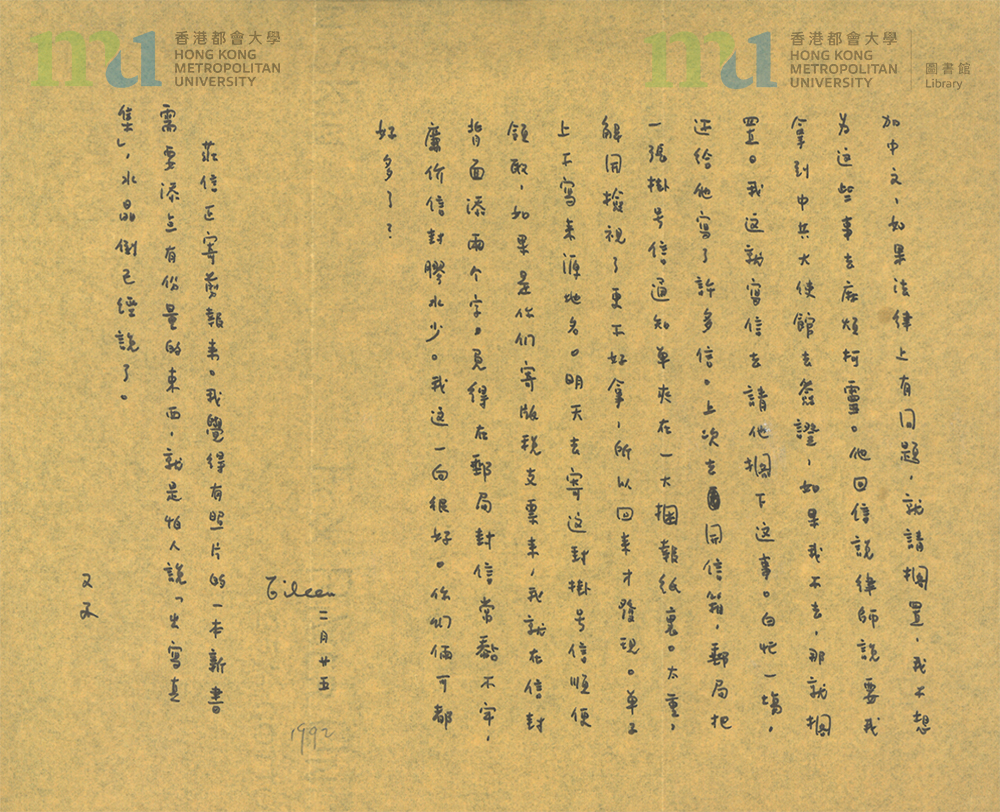 Part of: 06 - 張愛玲致宋鄺文美及宋淇信件 (1992年2月25日) = Letter from Eileen Chang to Mae Fong Soong and Stephen Soong (25 February 1992) (2 objects)