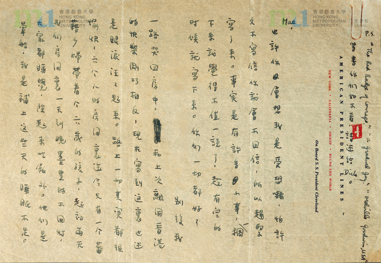 Part of: 03 - 張愛玲致宋鄺文美信件 (1955年10月25日) = Letter from Eileen Chang to Mae Fong Soong (25 October 1955) (6 objects)