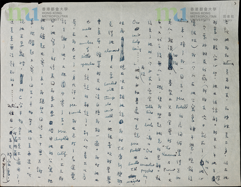 頁3 = page 3 | 張愛玲致宋鄺文美信件 (1955年11月20日) = Letter from Eileen Chang to Mae Fong Soong (20 November 1955)