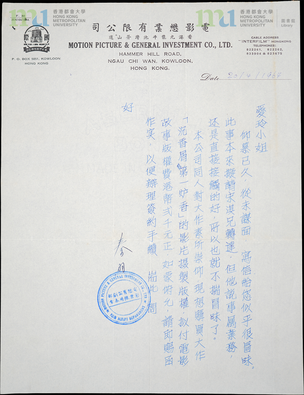 35 - 秦羽致張愛玲信件 (1964年4月20日) = Letter from Nellie Chin Yu to Eileen Chang (20 April 1964)