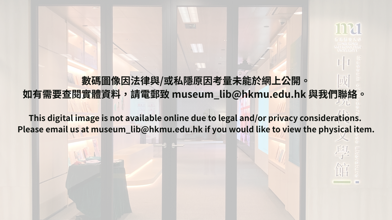 數碼圖像因法律與/或私隱原因考量未能於網上公開。如有需要查閱實體資料,請電郵致 museum_lib@hkmu.edu.hk 與我們聯絡。 This digital image is not available online due to legal and/or privacy considerations. Please email us at museum_lib@hkmu.edu.hk if you would like to view the physical item.