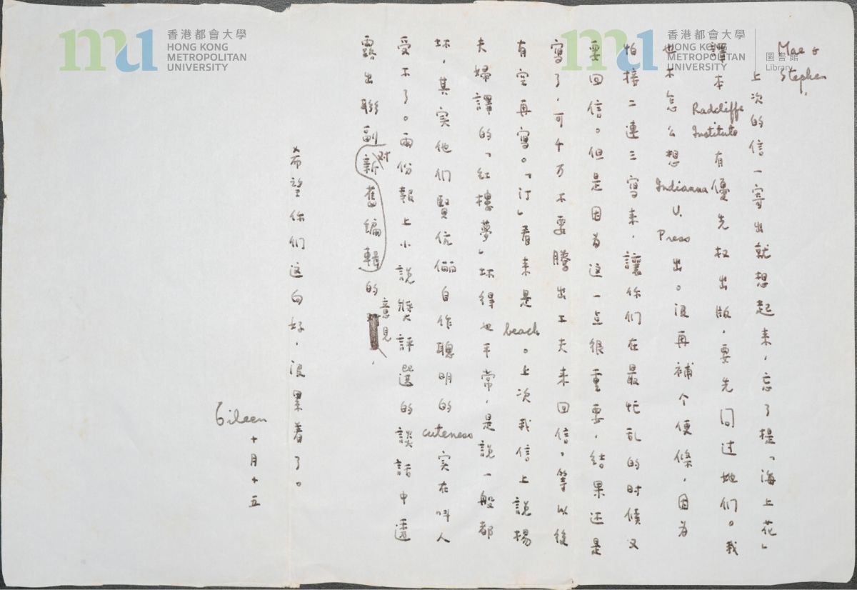 Part of: 10 - 張愛玲致宋鄺文美及宋淇信件 (1979年10月15日) = Letter from Eileen Chang to Mae Fong Soong and Stephen Soong (15 October 1979) (2 objects)