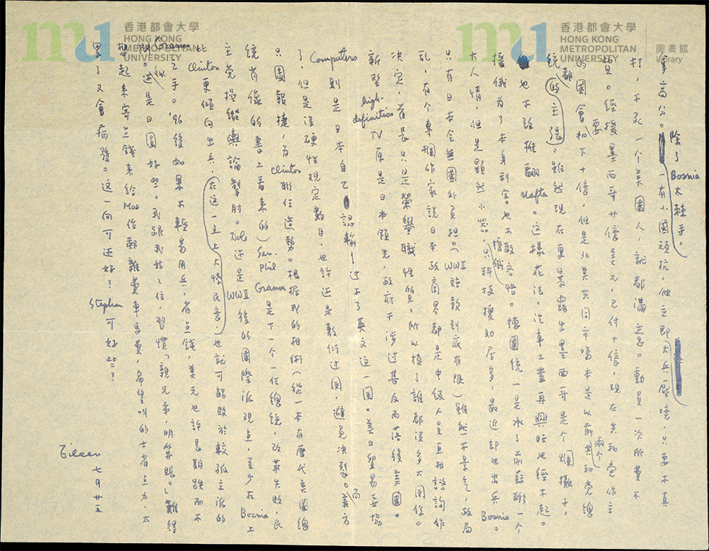 Part of: 44 - 張愛玲致宋鄺文美及宋淇信件 (1995年7月25日) = Letter from Eileen Chang to Mae Fong Soong and Stephen Soong (25 July 1995) (5 objects)
