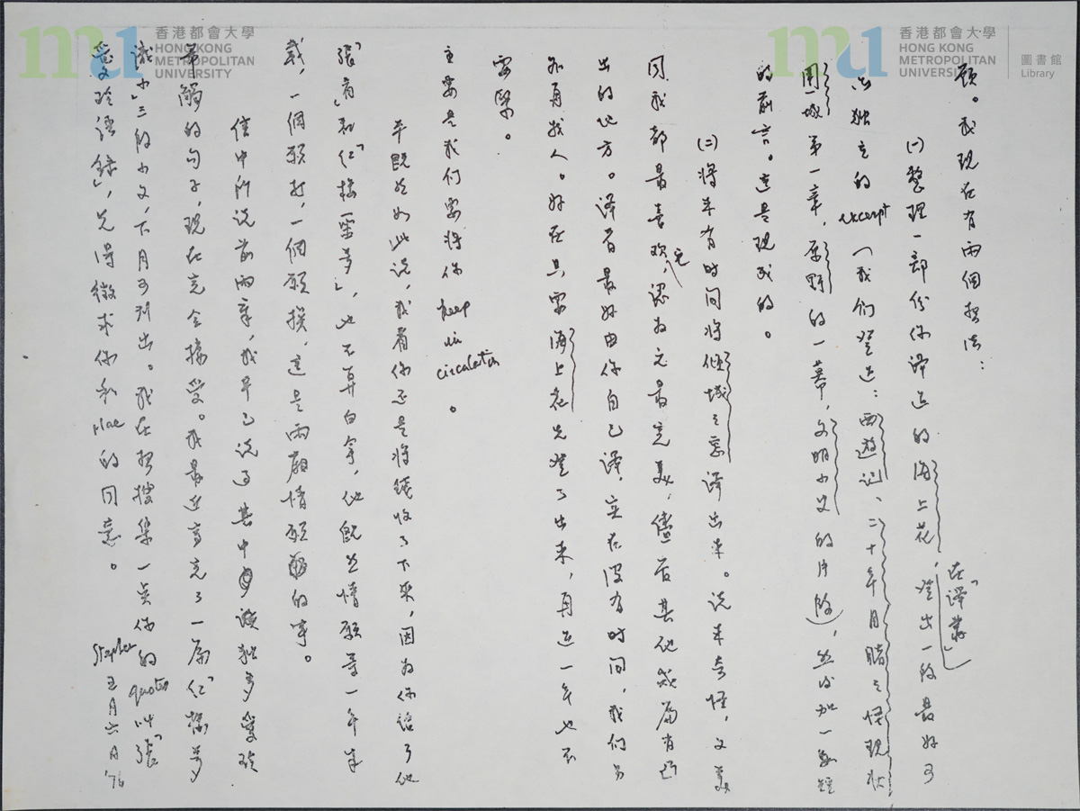 Part of: 09 - 宋淇致張愛玲信件 (1976年5月6日) (影印本) = Letter from Stephen Soong to Eileen Chang (6 May 1976) (Photocopy) (2 objects)