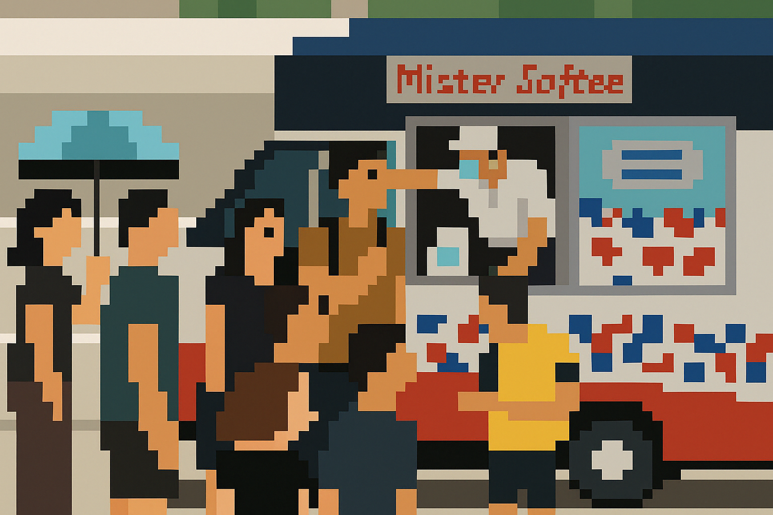 Mobile Softee was originally known as Mister Softee and changed its name in the 2010s. The brand, a historic icon of Hong Kong, features a mobile ice cream truck with a distinctive white, red and blue design that plays the music box-style melody "The Blue Danube".