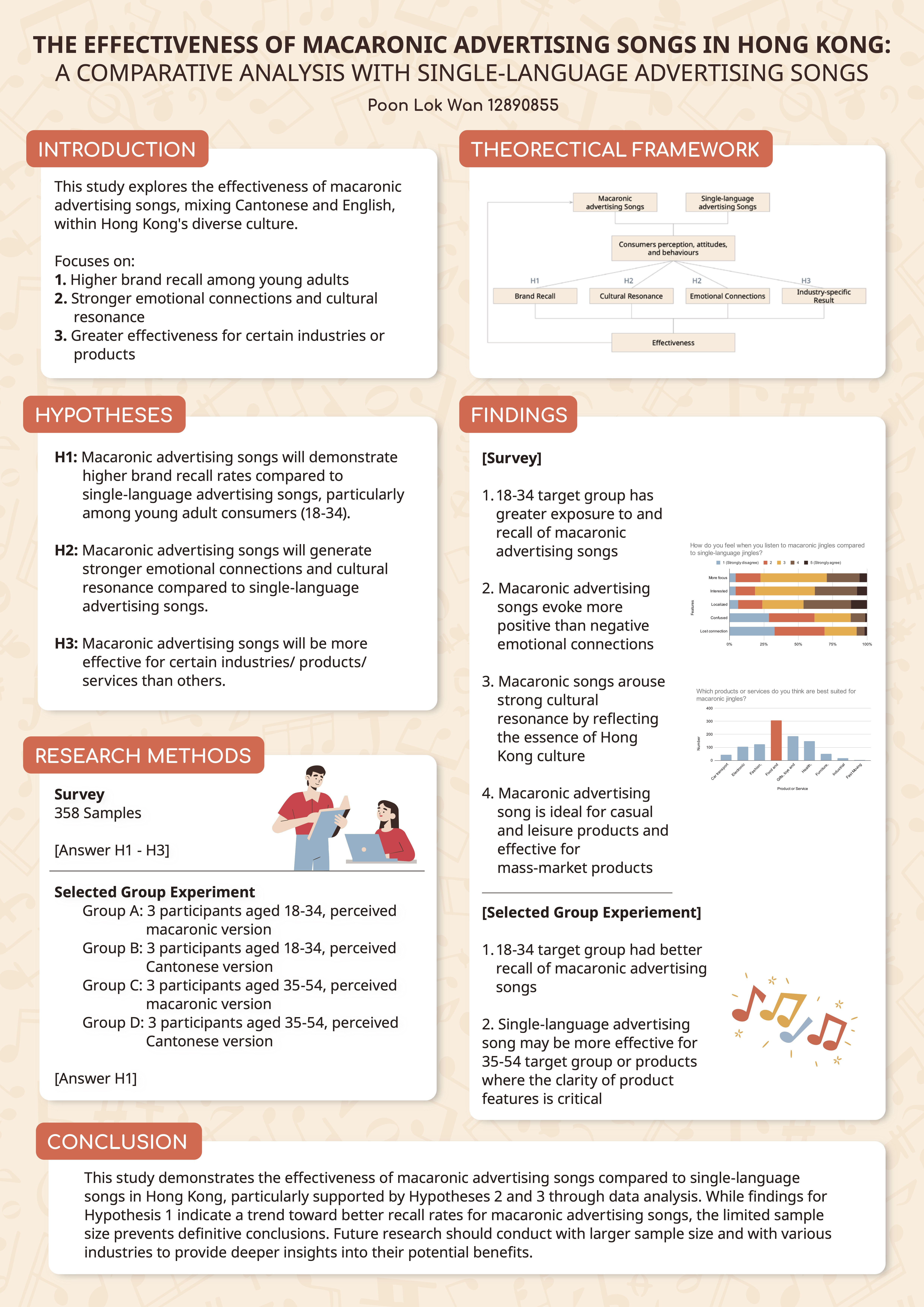 The research examines how these linguistic strategies influence brand recall, emotional connections, and cultural resonance across different age groups. Utilizing a hybrid approach of quantitative questionnaires and qualitative experiments, the study tests three hypotheses. Findings reveal that macaronic songs significantly enhance brand recall and emotional engagement, particularly among young adults (ages 18-34), while older adults (ages 35-54) show a preference for single- language songs. This highlights generational differences in engagement. Additionally, the study identifies that leisure and mass-market products are well-suited for macaronic songs, whereas industrial products benefit from single-language clarity. The research suggests future studies should expand demographic representation and explore various industries, emphasizing the need for adaptive advertising strategies in Hong Kong's dynamic market.