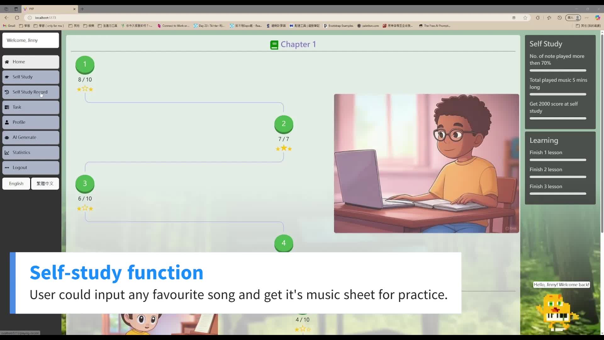 This project aims to develop a web application for piano learner to learn music theory and piano techniques with practices in a more attractive way to increase student motivation to learn piano. The web application need user connect to a MIDI piano for real time interactions. The web application will exploit AI to transform music style for students to learn piano from diverse repertoire. Also, web applications will design more like a game. We want to create a solution that can make the music learning more engaging and personalize.