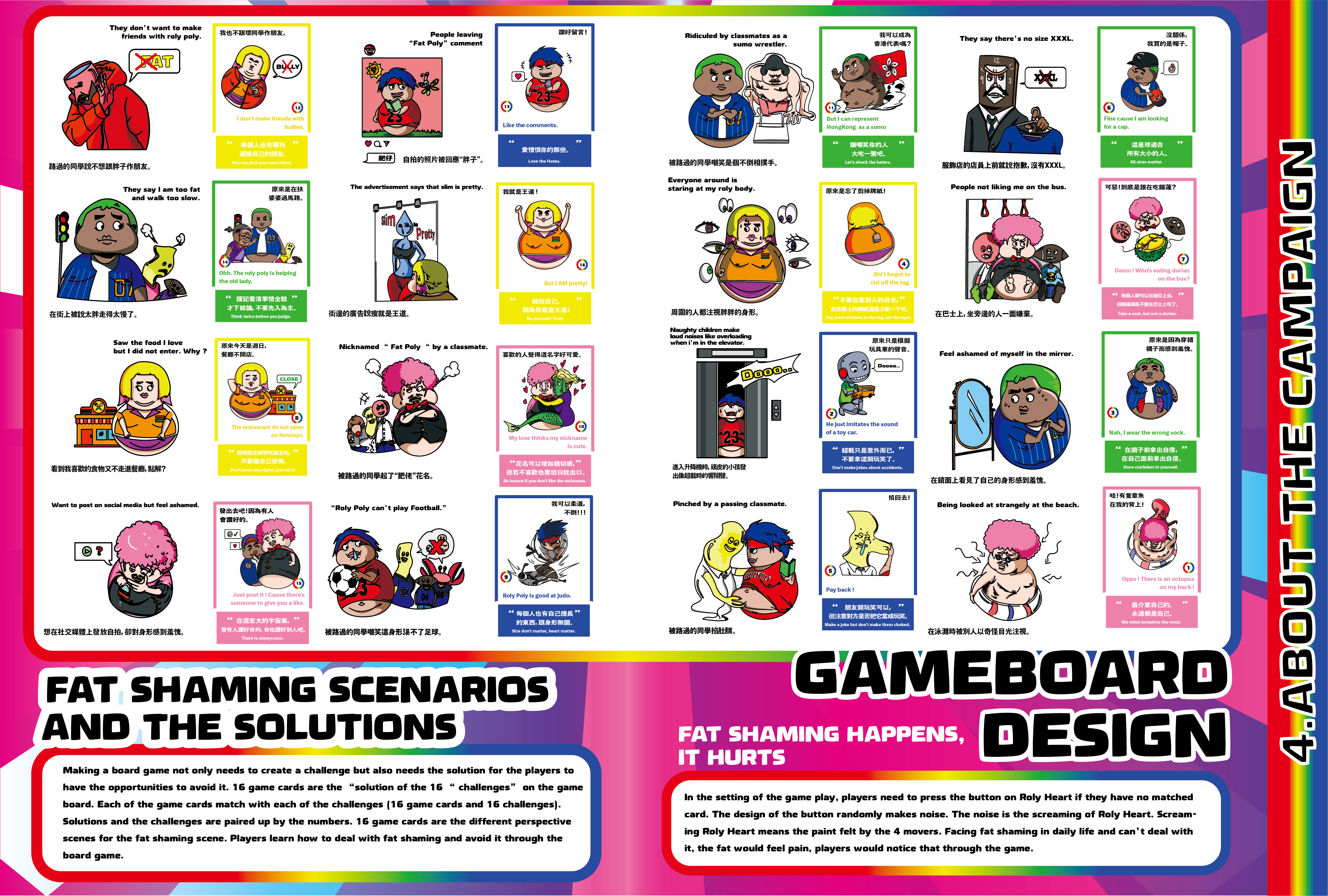 「肥胖羞辱」是香港中學生一個常見的問題,但青少年對這個概念卻缺乏了解。創作團隊以「Feel不倒不是Feel不到」為主題,展開反對肥胖羞辱的宣傳計劃,以不倒翁比喻身形肥胖的人,透過桌上遊戲「咪叫!不倒翁!」和移動展覽車「不倒翁的移動士多」兩個主要宣傳項目,令青少年意識到肥胖羞辱帶給被辱者的心理傷害,從而提升中學生及大眾對不同身形的包容度。