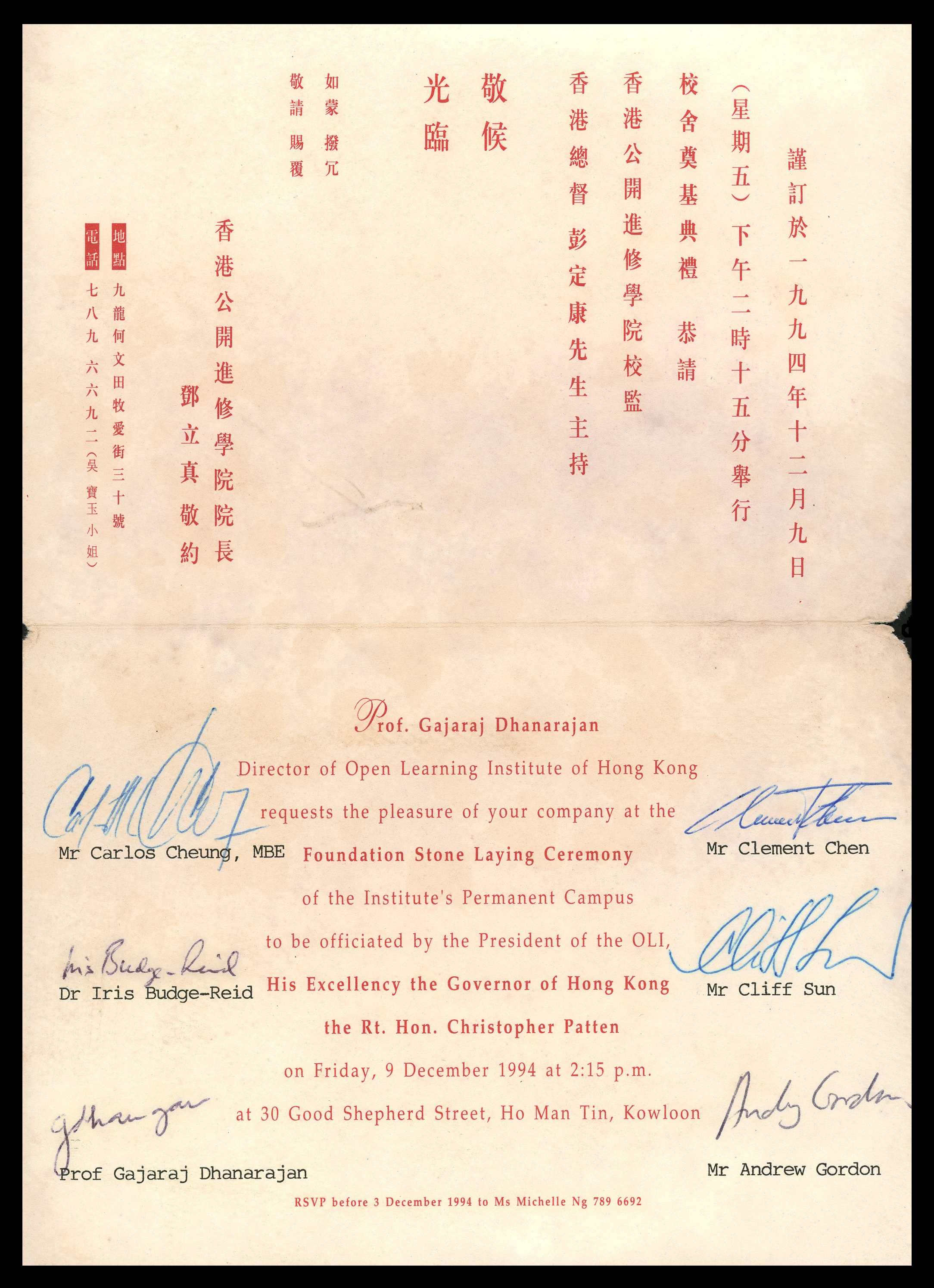 Invitation card of the Foundation Stone Laying Ceremony of the Permanent Campus which was signed by all members of Project Management Committee = 建校管理委員會全體成員親筆簽名的校舍奠基典禮邀請卡